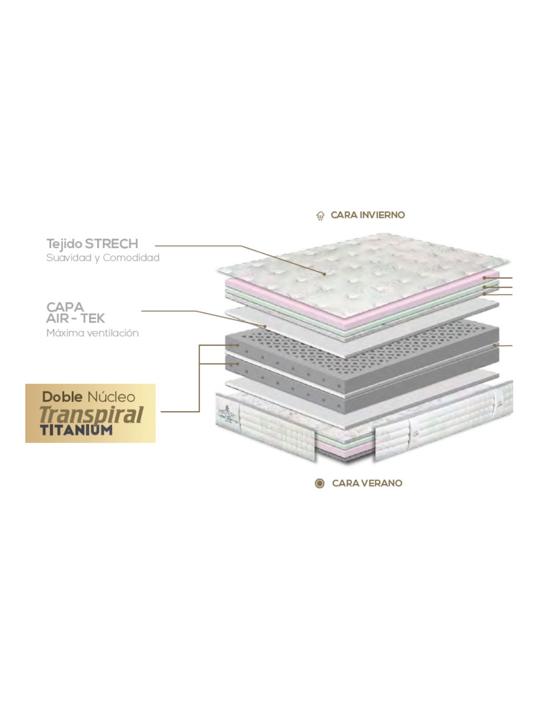 • El núcleo Transpiral Titanium tiene 85 Kg/m3 de densidad, una de las más altas de todo el mercado, mejorando así su durabilidad y comodidad.
