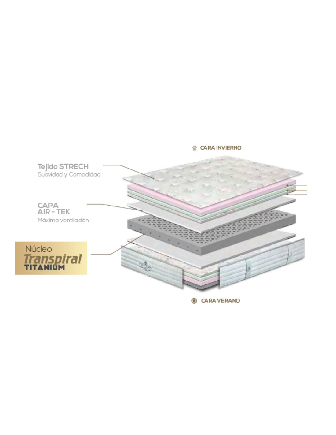 • El núcleo Transpiral Titanium tiene 85 Kg/m3 de densidad, una de las más altas de todo el mercado, mejorando así su durabilidad y comodidad.