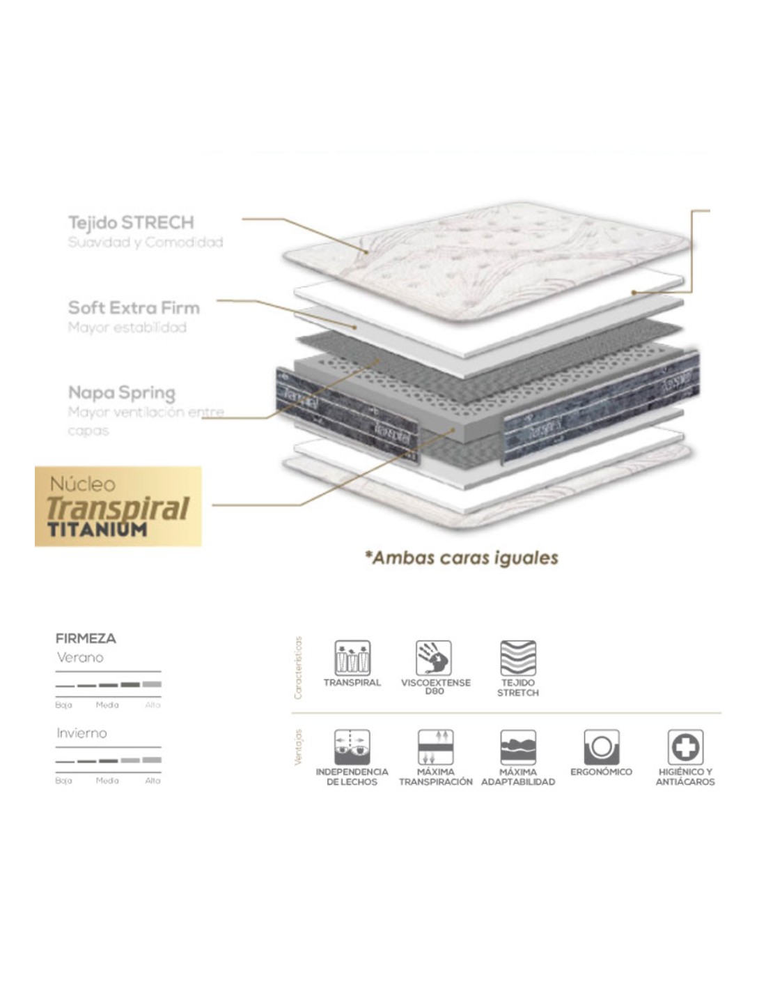 • El núcleo Transpiral Titanium tiene 85 Kg/m3 de densidad, una de las más altas de todo el mercado, mejorando así su durabilidad y comodidad.